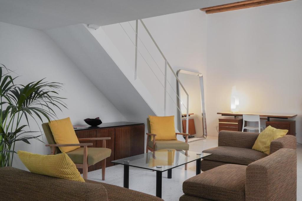 The apartment itself is on the ground floor, so no stairs to get in. The only internal staircase is the one leading up to the mezzanine bedroom.