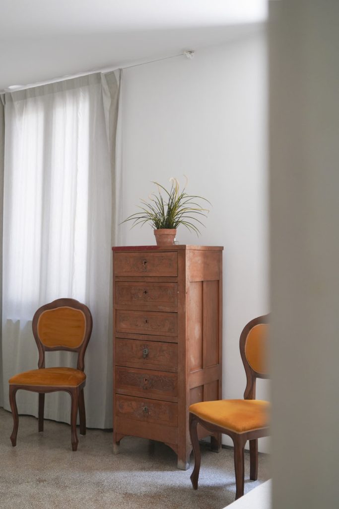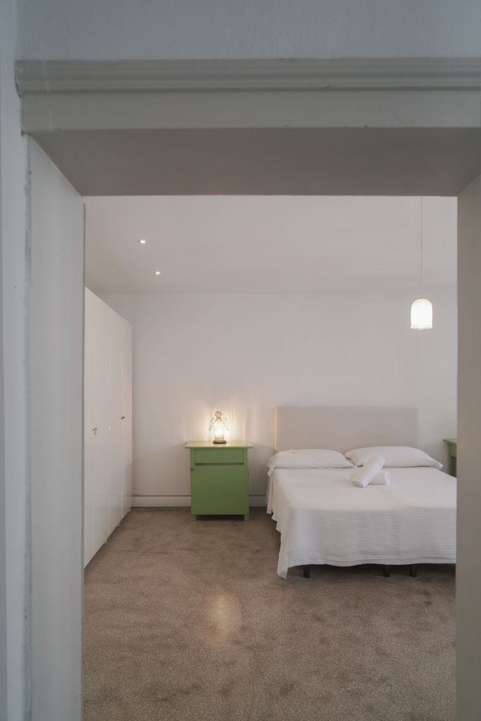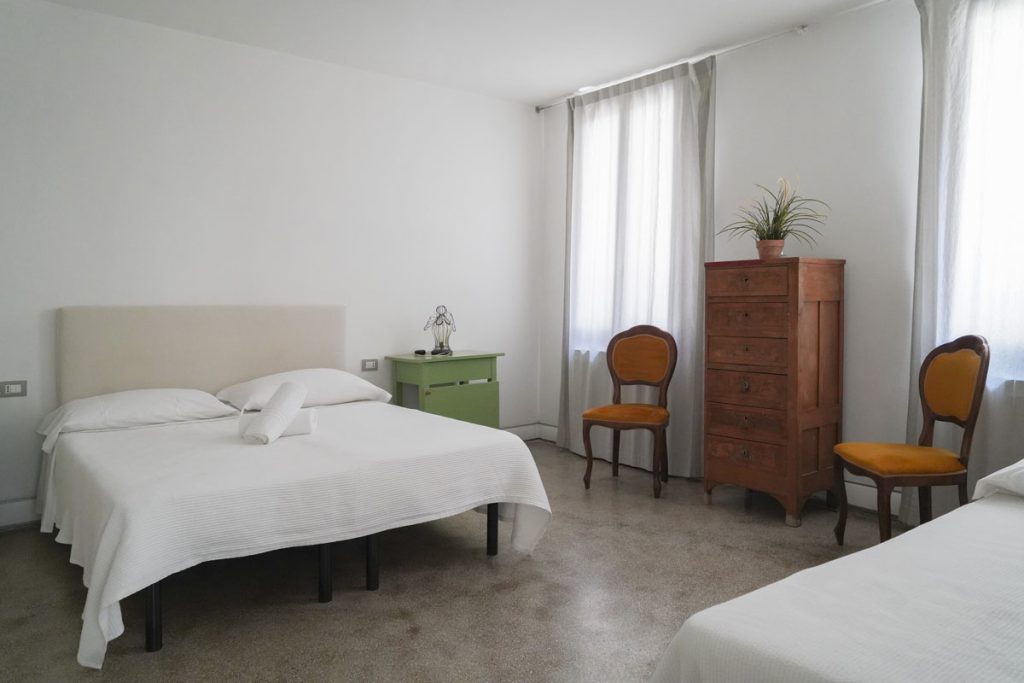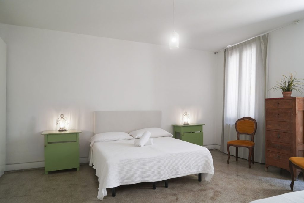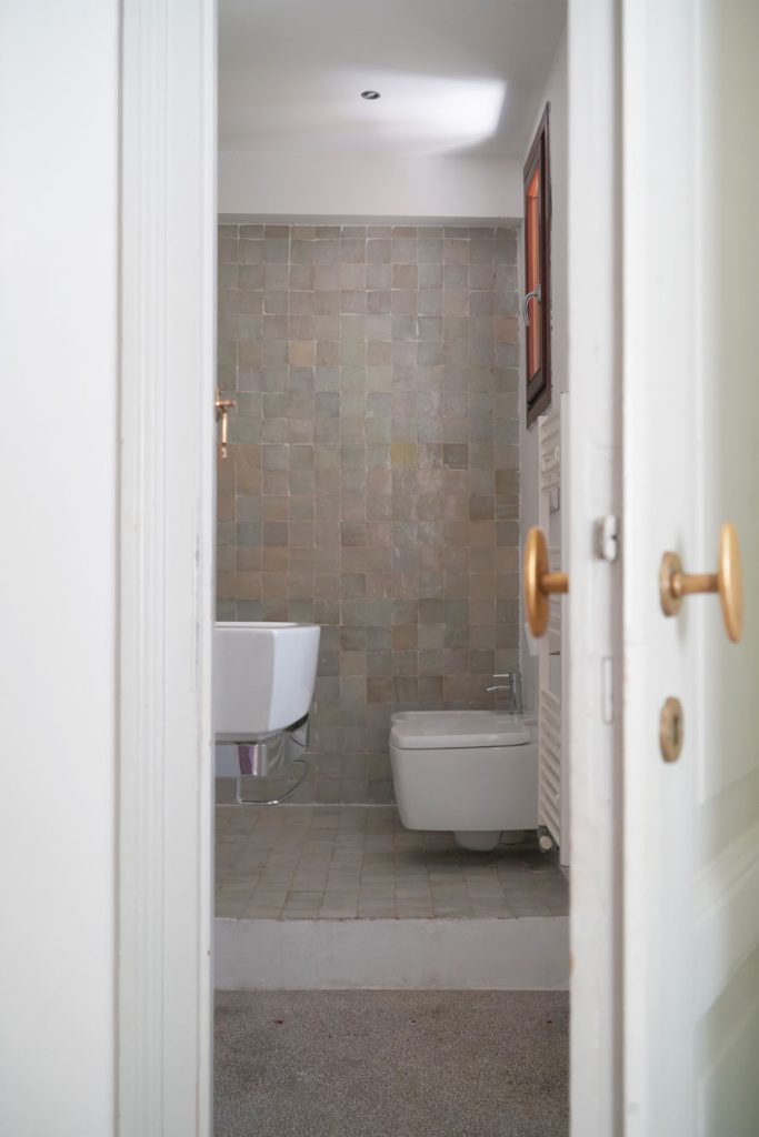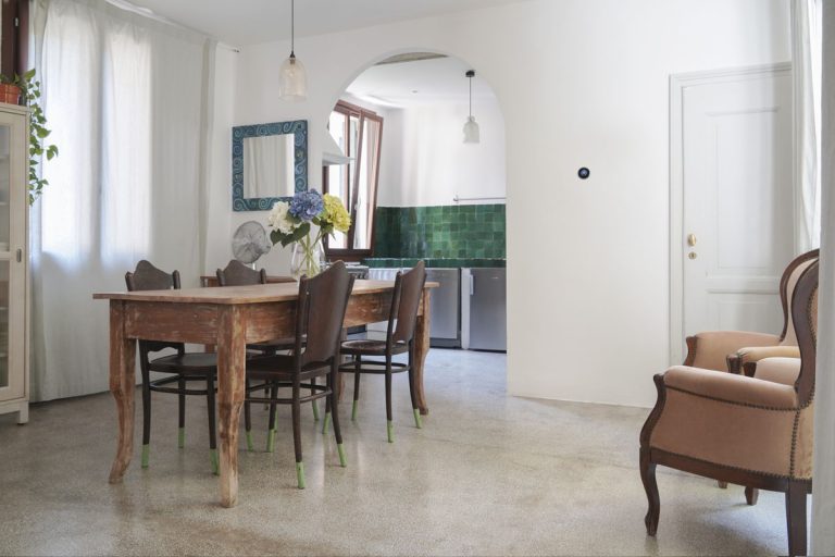 The kitchen is where the chromatic research is most evident: the coloured zellige tiles give it a lively, contemporary feel. It’s fully equipped — hob, oven, microwave, fridge, dishwasher, toaster and coffee machine. There’s a dining area with table and chairs, practical for anyone who wants to cook and eat together. The bedroom has a queen-size double bed and a single bed, a good configuration for families or small groups. The bathroom has a combined bath and shower, bidet, and all the essentials. The layout is open and connected throughout to keep the natural light moving through the space. Ceilings are high in the Venetian tradition, floors are tiled, and the furnishings have been chosen with care.