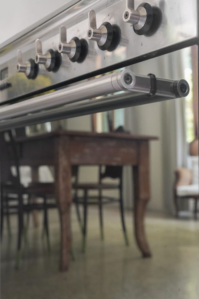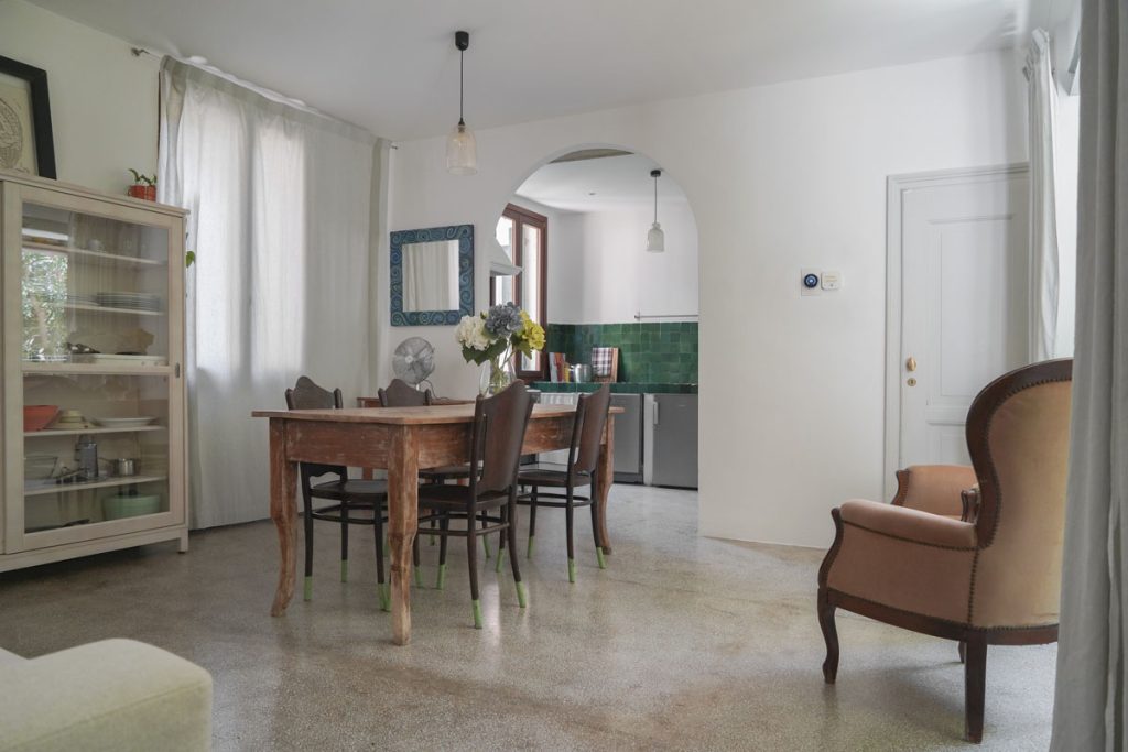 Ca Melusina is the right apartment for those who want to be in the heart of Venice without giving up peace and quiet. It sits on a little-travelled calle in Castello, one of those streets where Venetians still go about their daily lives. What stands out immediately are the large windows that look onto private gardens — a kind of natural light that’s rare in the historic centre. The apartment has been put together with genuine attention to design. There’s a clear chromatic sensibility running through every room, most visible in the kitchen where coloured zellige tiles create a lively contrast with the neutral tones elsewhere. The layout is open and connected, precisely to let the natural light from the windows move through the space. 60 square metres with room to breathe — well suited to families or small groups who want both space and character. The first floor is low and easily accessible, so manageable with children or luggage.