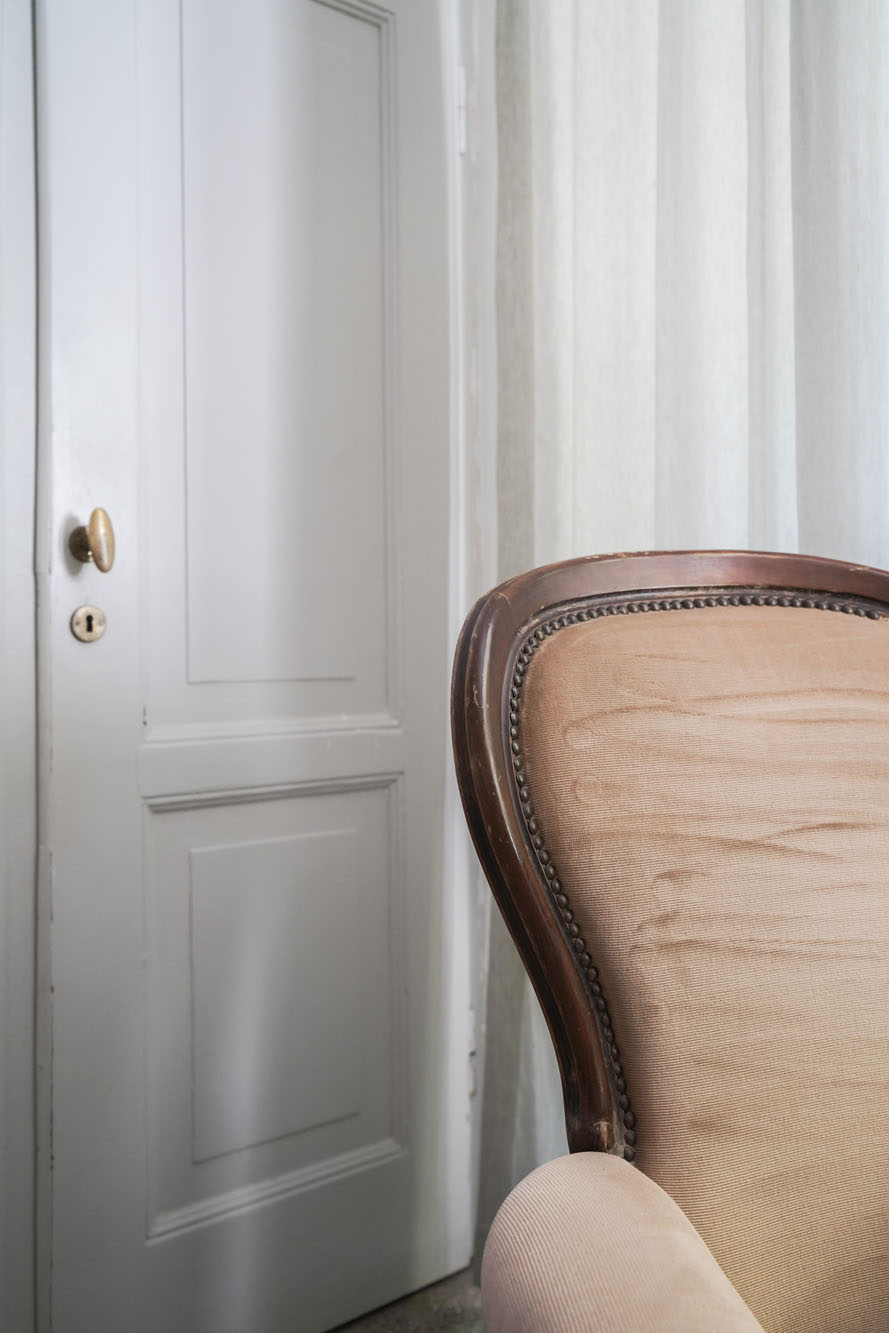 Ca Melusina covers 60 square metres on the first floor of a typical Venetian building. The floor is low, so accessible even with children or luggage. A private entrance leads into a hallway that connects all the rooms. The living area is spacious and light-filled, with a sofa bed that allows for additional guests, and looks out over the private gardens through large windows.