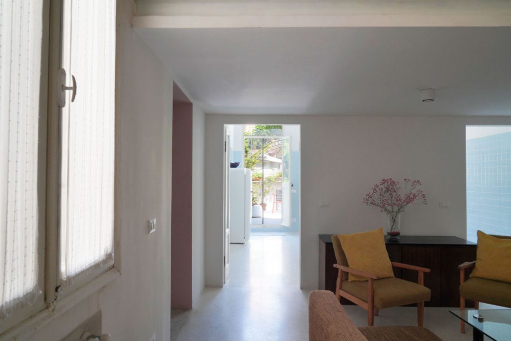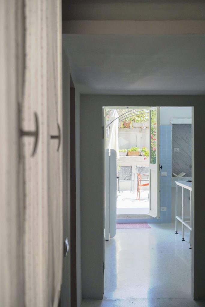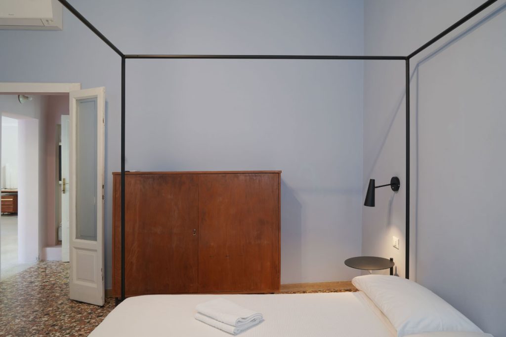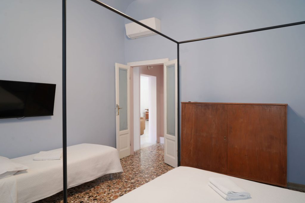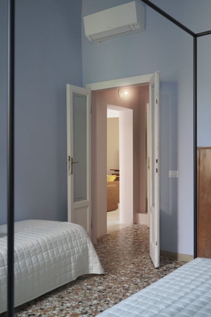 The 120 sqm apartment is on a single level on the first floor (no lift) and includes two spacious bedrooms, a large open-plan living area that opens onto the terrace, a proper kitchen and a full bathroom. The layout comfortably accommodates up to 4 people, with the option to add a cot. The living area is well-lit, with windows looking onto the internal gardens and the terrace. The 4-metre ceilings with original exposed beams from the historic palazzo give the rooms a sense of volume and character.