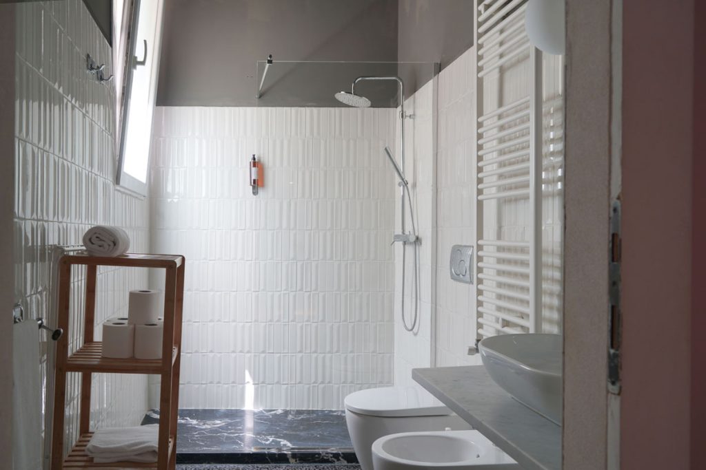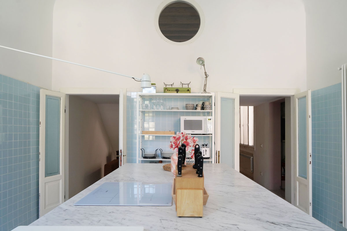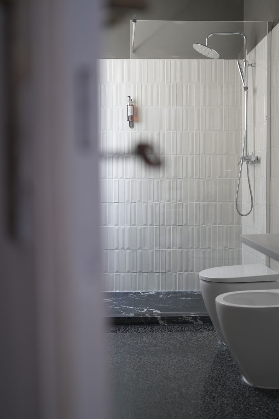 The kitchen, custom-designed in Carrara marble with a metal frame, is fully equipped for serious cooking. The bathroom has an elegant contrast between black marble and white Vogue tiles, with both a bathtub and a shower. Venetian terrazzo floors run throughout the apartment, while the original 18th-century floor has been kept in the main bedroom. The large 35 sqm terrace, accessible from the living room, has outdoor furniture and an al fresco dining area — a natural extension of the living space.