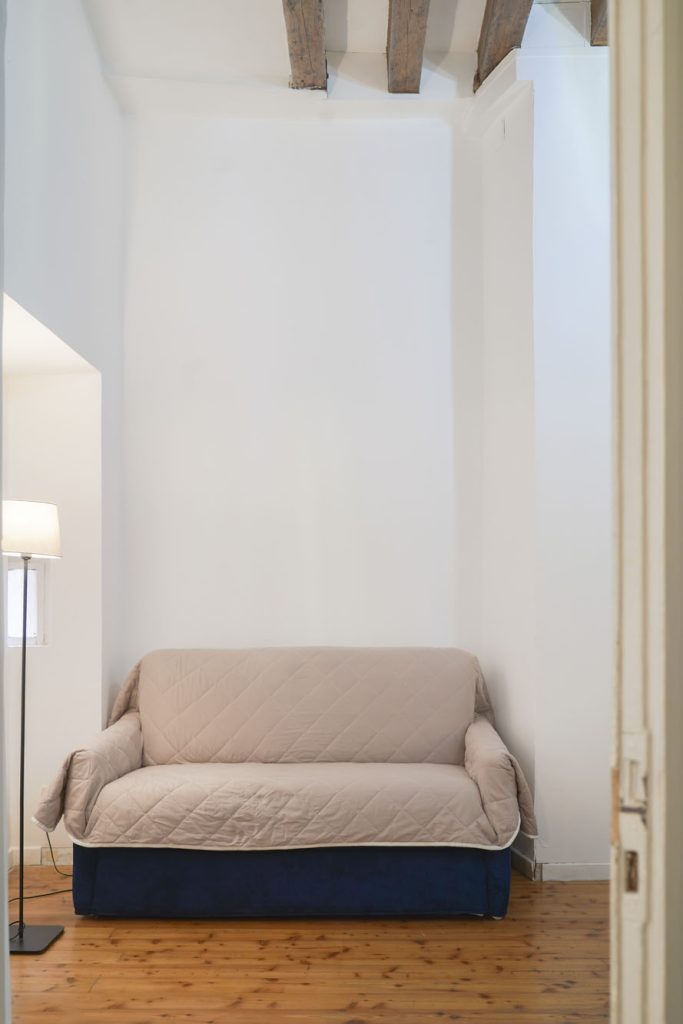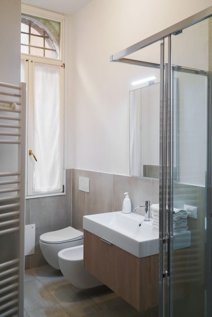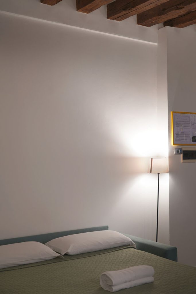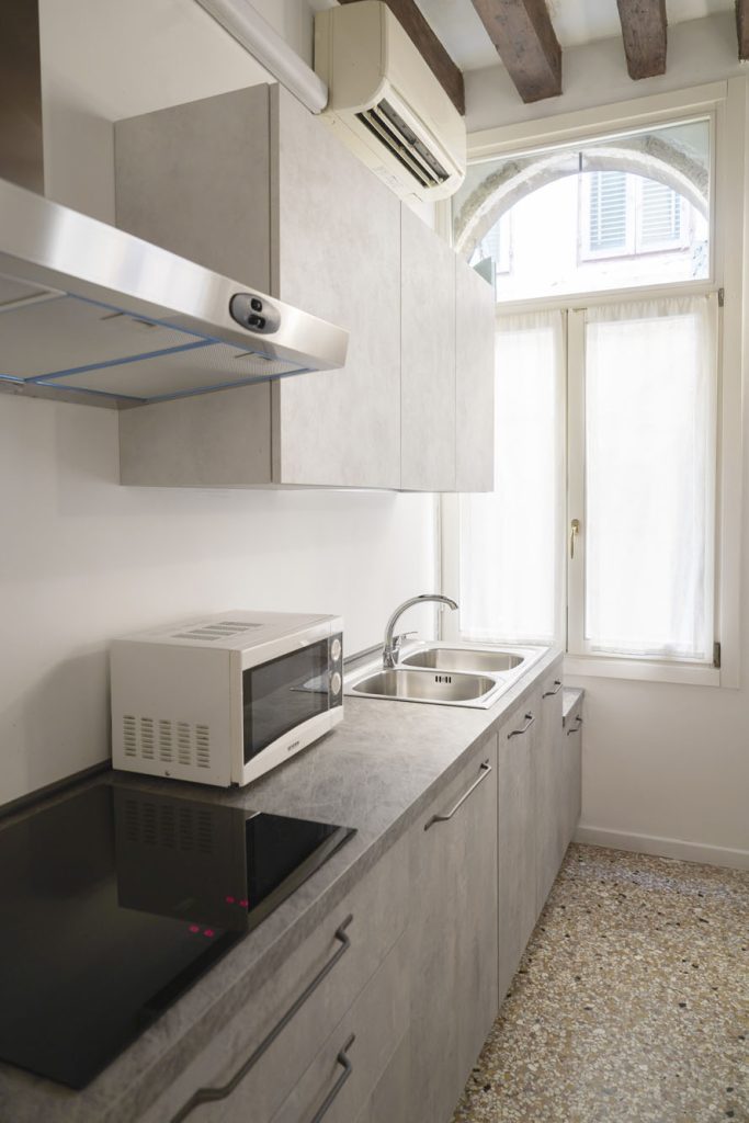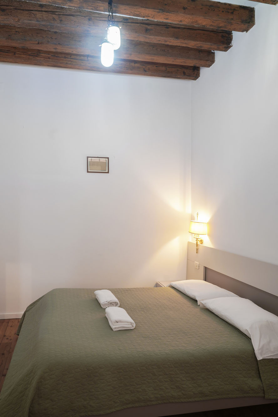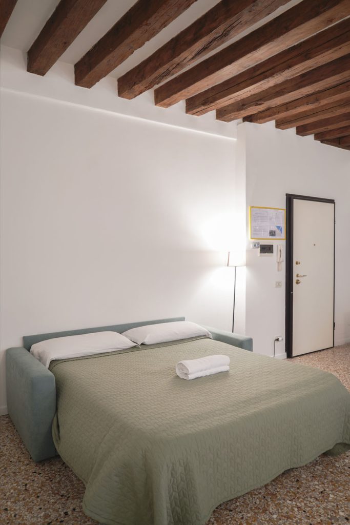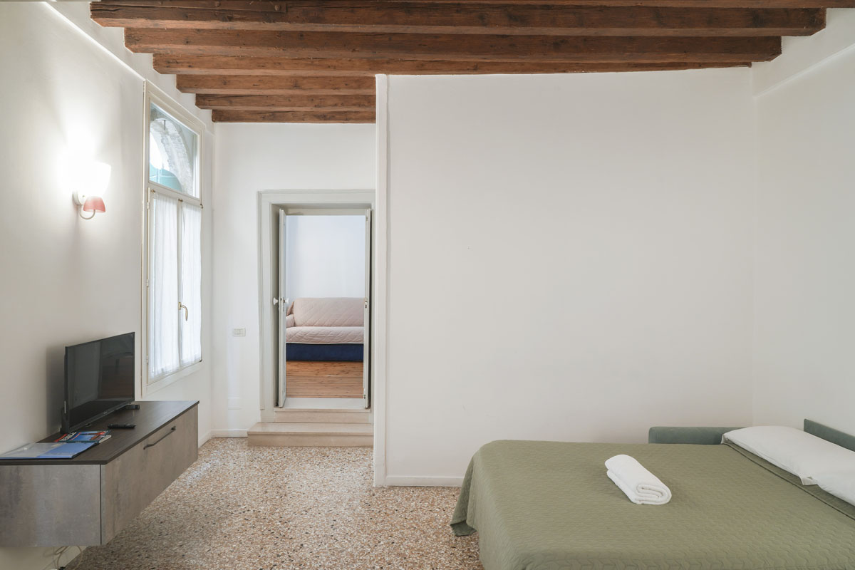 Rialto 2 is for those who want to be exactly where Venice is most alive. The position is hard to beat: you’re steps from the Ponte di Rialto, so crossing it comes naturally rather than feeling like an outing. The market is right outside: in the morning you go down and pick up fresh fish and vegetables from the stalls, as Venetians have done for centuries. The large bedroom has a king-size bed and a single — a practical configuration for parents with a child — and the double bed in the living room takes two more guests. The kitchen is fully equipped, so you can cook with whatever you’ve bought at the market that morning. The vaporetto stop is close, connecting you easily to the whole city. San Marco is 5 minutes on foot, but here you’re living the more authentic side of Venice: the historic bacari, the osterie, the daily rhythm of the market.