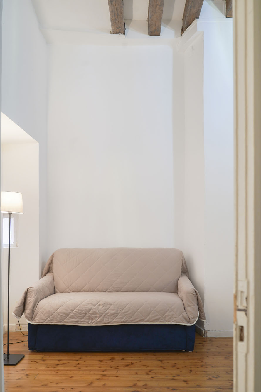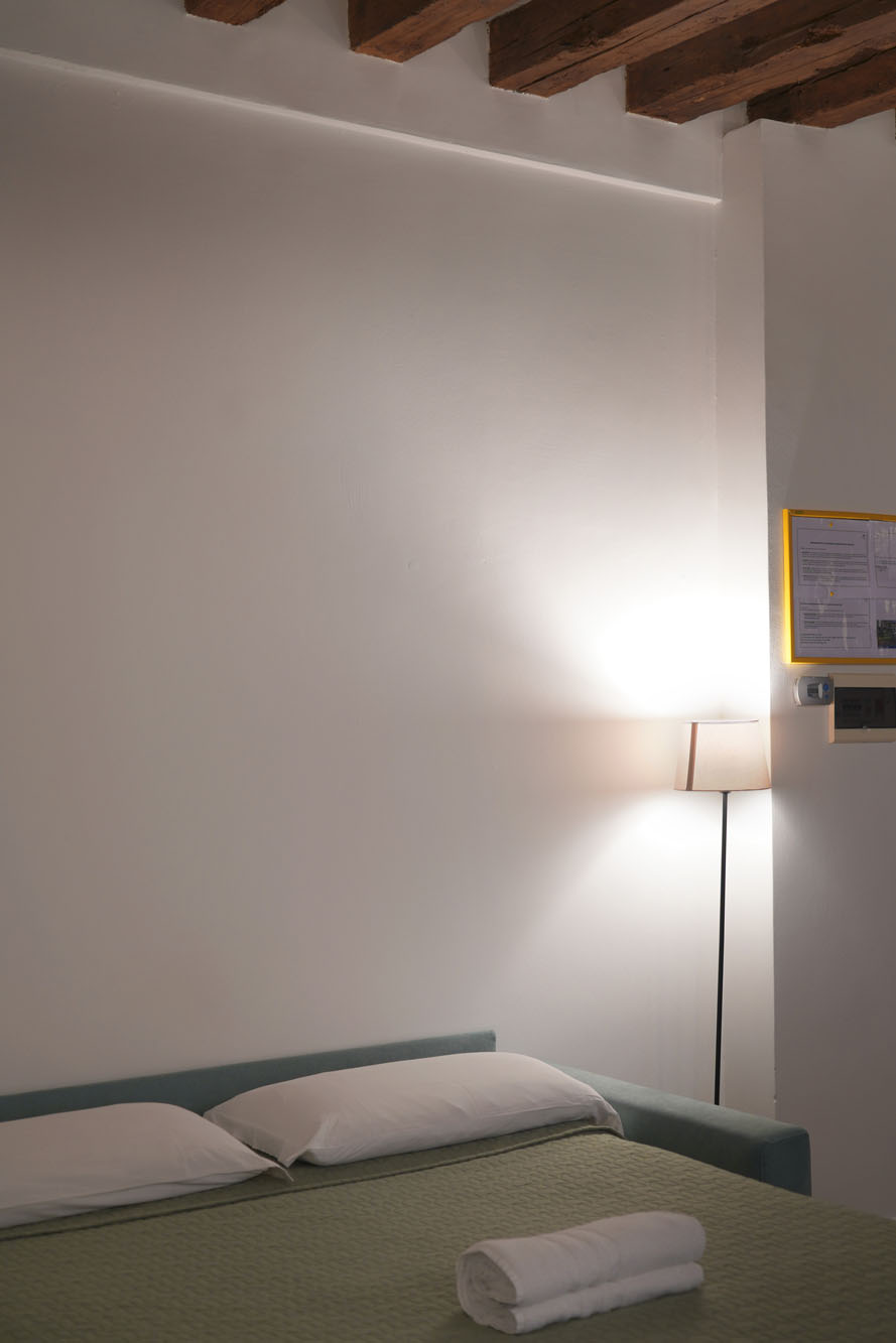 Rialto 2 covers 55 square metres on the first floor of a building in the heart of San Polo, in the same palazzo as Rialto 1. A private entrance opens onto a space on a single level with no internal stairs. The bedroom is large and well-lit, with a king-size bed and a single — a good fit for families with a child or three friends. The living room is spacious and has a double bed for two additional guests.
